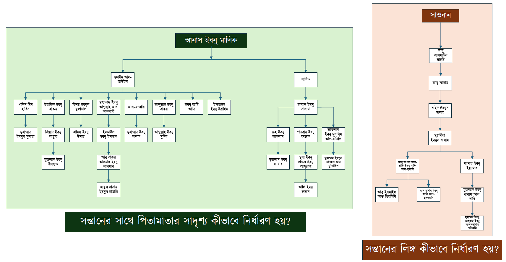 চিত্র ২ – হাদিসের দুই রিওয়ায়াতের বর্ণনার পথ। সবুজ রিওয়ায়াতে সন্তানের সাথে পিতামাতার সাদৃশ্যের ও কমলা রিওয়ায়াতে সন্তানের লিঙ্গের উল্লেখ আছে।